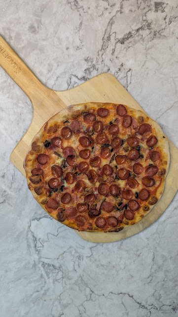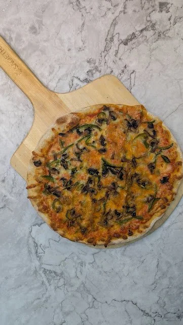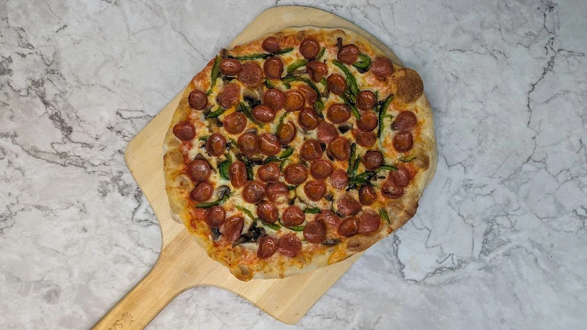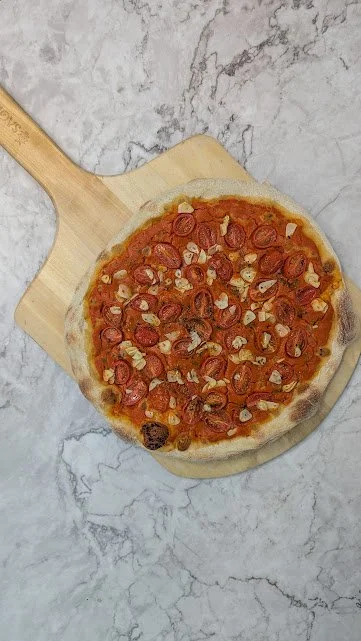 Marinara, mozzarella, champignons, poivrons verts, pepperoni