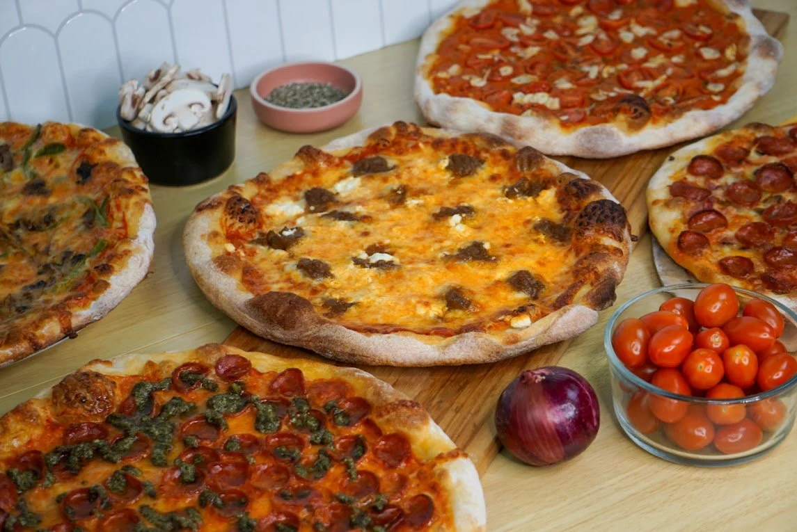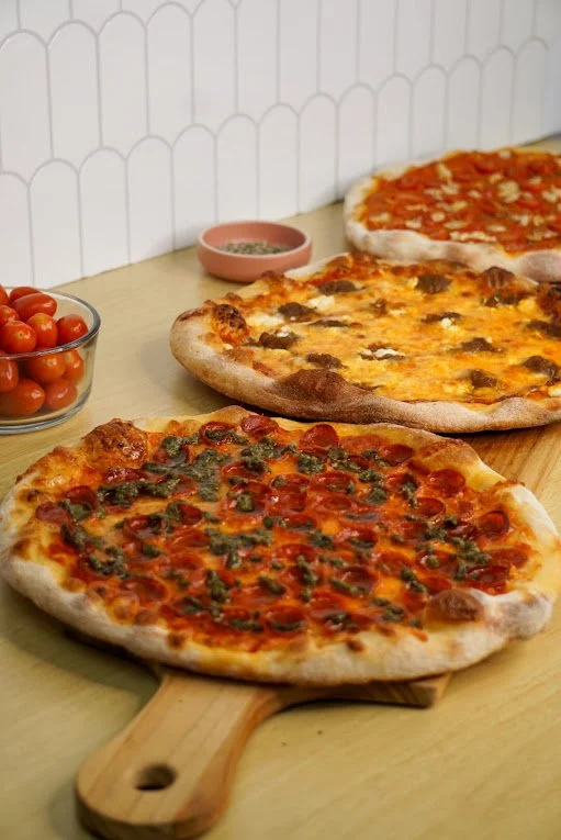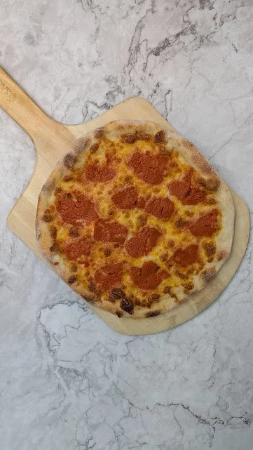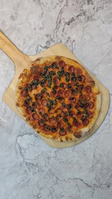 Marinara, mozzarella, pepperoni, pesto, miel épicée