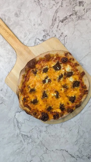 Marinara, mozzarella, oignons caramélisés, fromage de chèvre, miel épicée